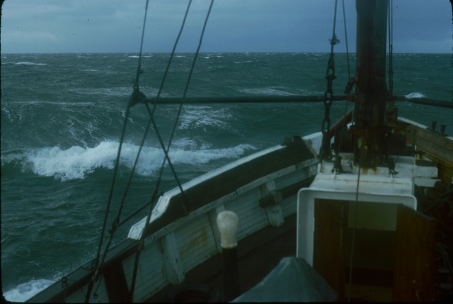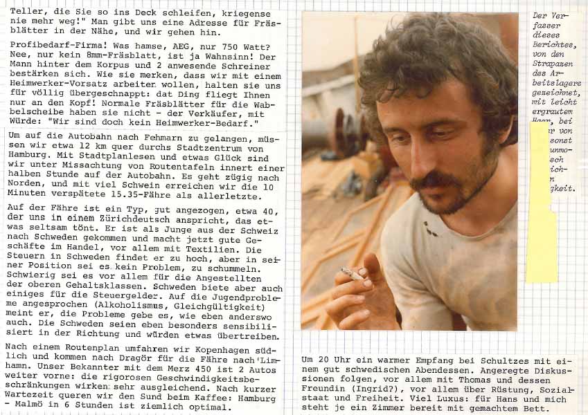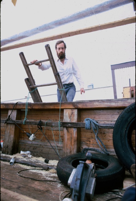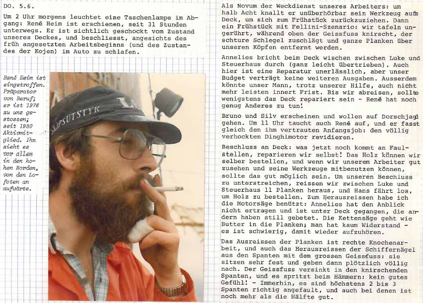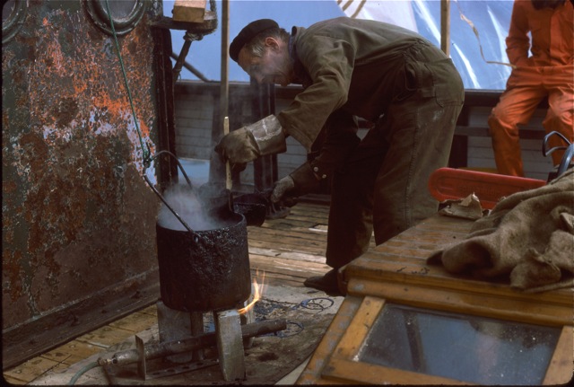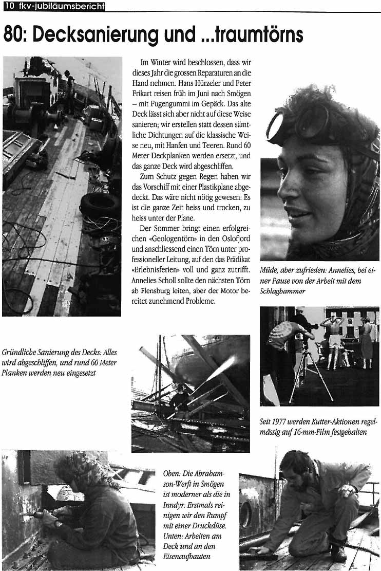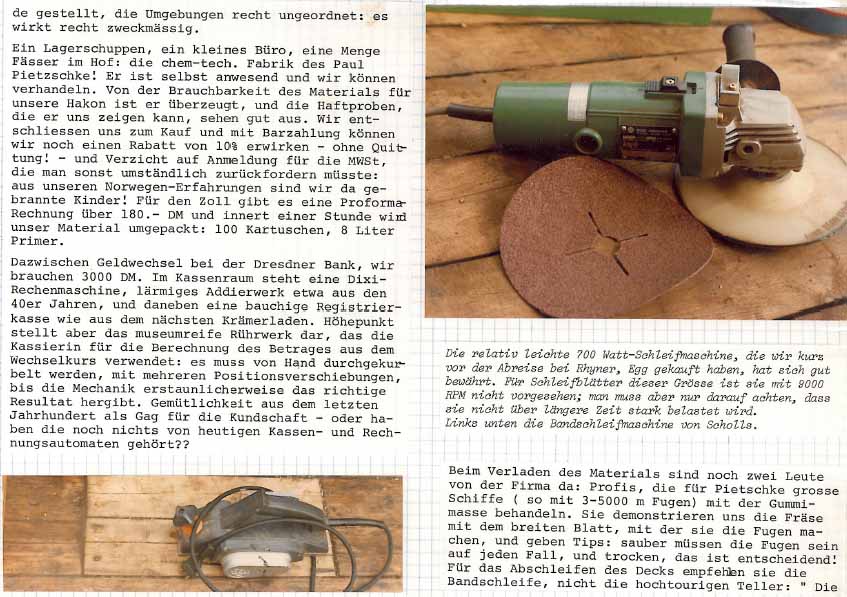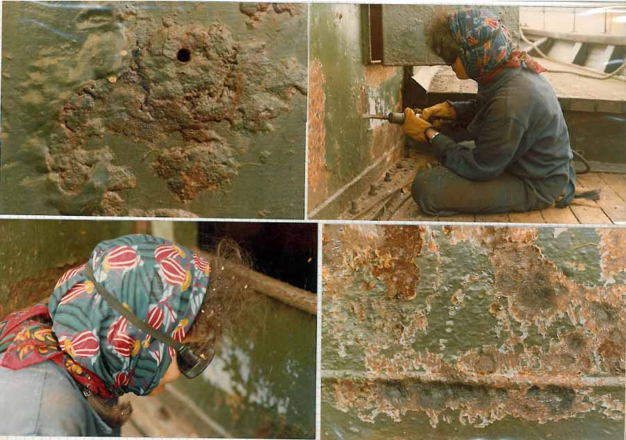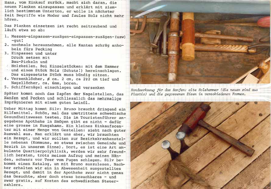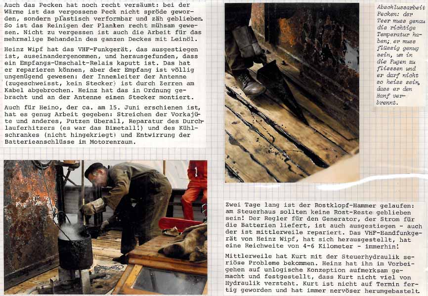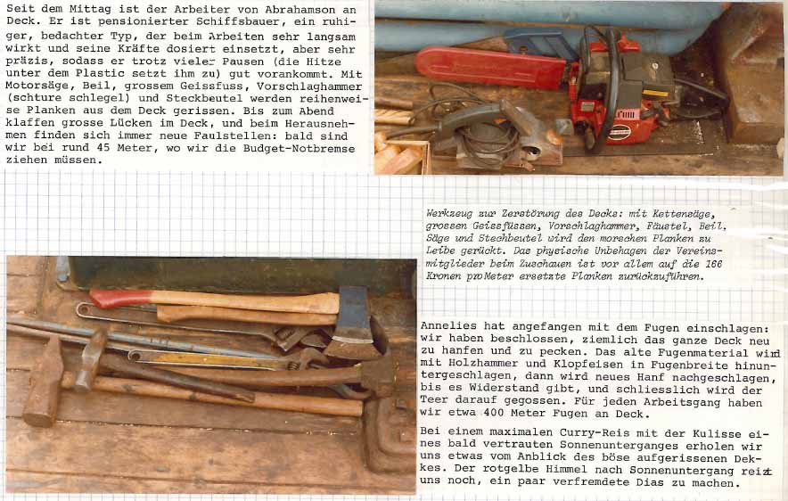 Das traditionell mit Teer und Hanf abgedichtete Kutterdeck war immer wieder undicht. Das konnte nicht nur die Freude am Törn verderben, wenn es nachts plötzlich auf die Koje tropfte; es ruinierte auch unsere ganzen technisch-elektrischen Einbauten. Es musste also dringend Abhilfe geschaffen werden. Wir wollten alle Fugen mit modernem Fugengummi sanieren, aber es zeigte sich, dass die Holzqualität unseres Decks dafür nicht geeignet war. So haben wir einen ganzen Teil des Decks entfernt und mit fachlicher Hilfe neu verlegt. Auf eine Polyester-Abdeckung wollten wir verzichten; am Kutter prangte eine Messingtafel: «If God had ment us to build fiber-glass-boats, he would have grown fiber-glass-trees.»