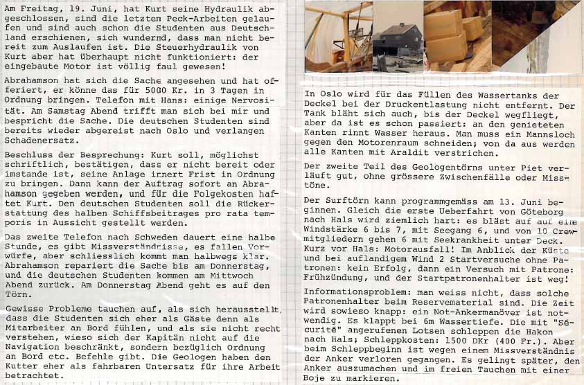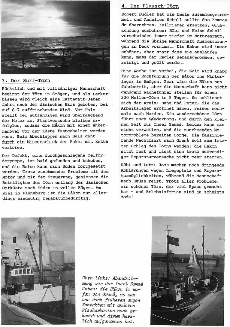 Die auf den grossen Arbeitseinsatz folgenden Törns verlaufen unterschiedlich glücklich. Beim Geologentörn ergeben sich Verzögerungen und durch ein Versehen beim Einfüllen entsteht Überdruck im Wassertank, was zum Bersten an der Kante führt und damit zu einer empfindlichen Komfort-Minderung. Die Håkon stösst nach Süden bis nach Flensburg vor, dort auf der Pier werden aber die Leute verschreckt mit einem Amok laufenden Motor. Die zunehmenden Motorprobleme lassen die Håkon in Grenå stranden, wo sie nicht bleiben kann.