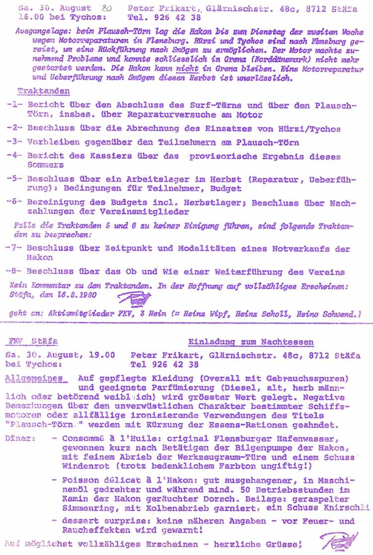 Eine typische Versammlungseinladung aus jener Zeit, vervielfältigt mit dem eigenen «Schnapsmatritzen»-Drucker (das war damals bei weitem das Günstigste):
