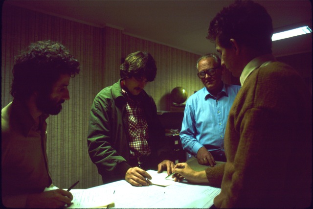 Im Oktober klären Heino Schwendener (Mitte), Peter Frikart (Links) und Anita Pfenninger die Motorprobleme mit dem Hersteller des Motors, Toralf Tande (Blaues Hemd), der immer noch eine Firma (Propeller-Herstellung) in Molde betreibt. Anschliessend werden die Lagerschalen nach Molde gebracht, wo das Weissmetall neu aufgegossen wird.