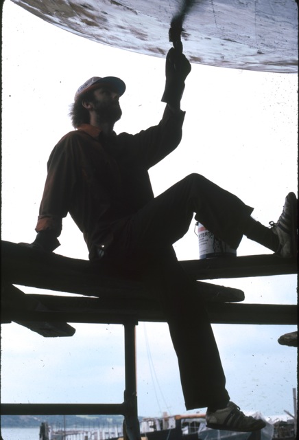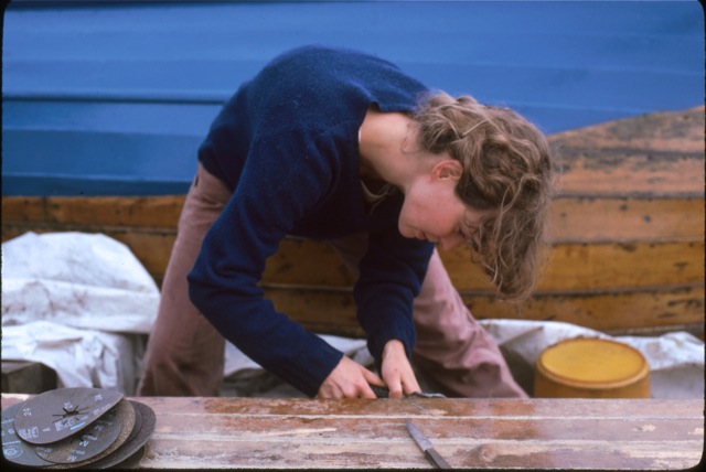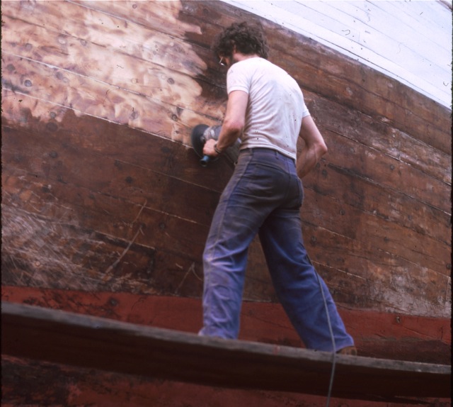 Werft-Arbeiten auf dem Slip (Trockendock): Peter Frikart müht sich ab mit den damaligen 7 kg schweren Schleifmaschinen