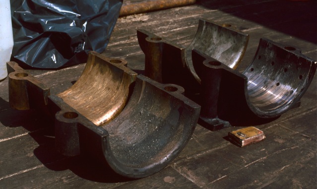 ... und dann der Frust: Nach dem ersten Schlag von Hobro nach Grenå ein Motorschaden. Hier die beschädigten Lagerschalen, die den Kolben mit der Kurbelwelle (Stärke 170 mm) verbinden. Das Weissmetall, eine Zink-Legierung, ist geschmolzen.