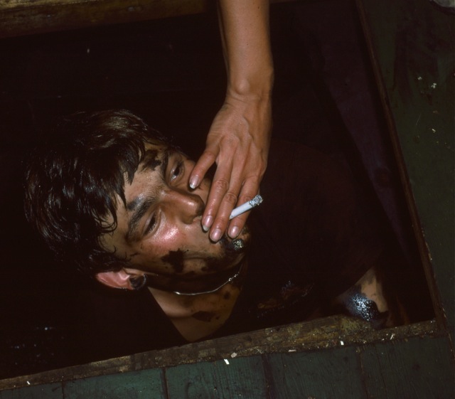 Heinz Scholl, Schwerarbeit in der Bilge, ganz unten im öligen Schiffsrumpf – Zigarettenpause mit Hilfe...