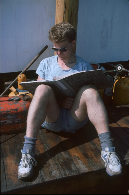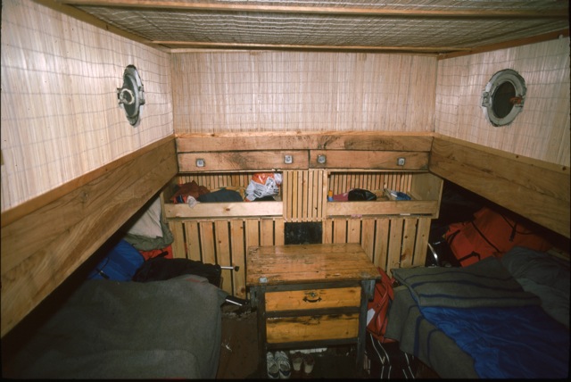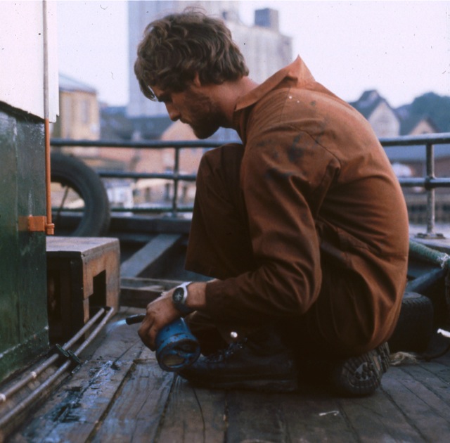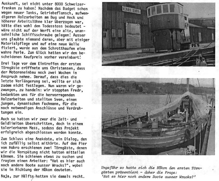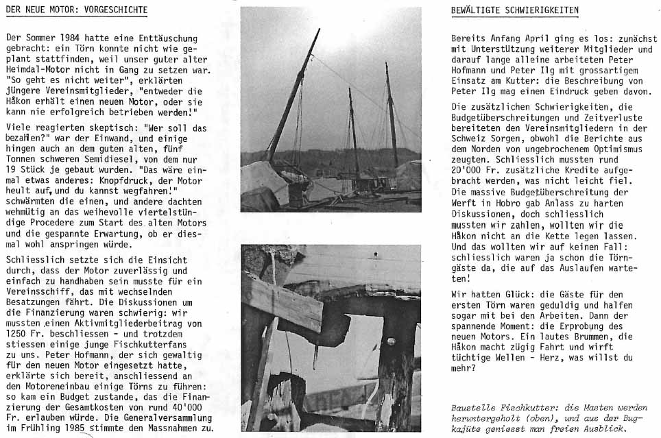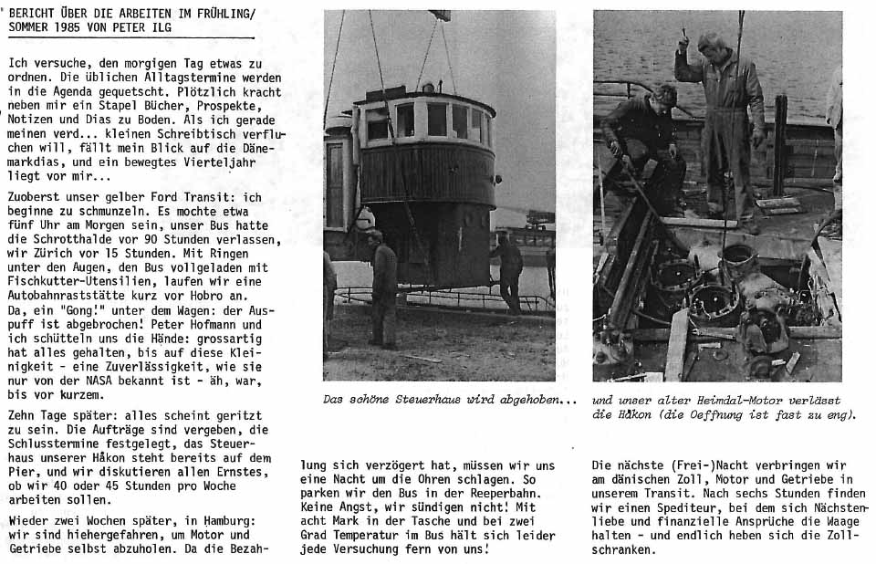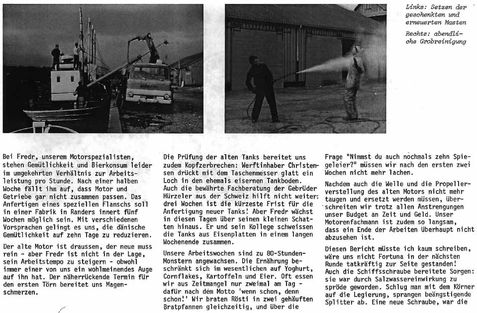 Wieder ein Gross-Einsatz: Peter Hofmann und Peter Ilg räumen in einem anstrengenden Arbeitseinsatz den 5 Tonnen schweren Glühkopf-Dieselmotor ab und setzen einen aktuellen MAN-Fünfzylinder-Dieselmotor ein, den wir als günstige Occasion erwerben konnten. Die Arbeiten sind sehr aufwändig, und als die ersten Törngäste erscheinen und nur ein «Wrack» mit abgebautem Steuerhaus an der Pier finden, fragen sie, wo denn der Fischkutter für ihren Törn sei...