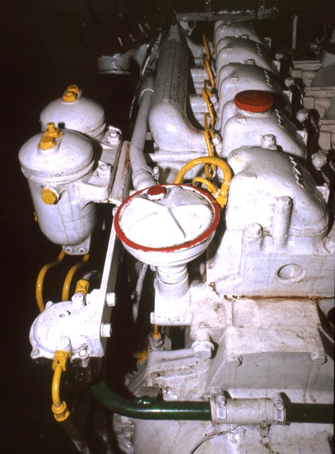 Der 1985 eingesetzte Dieselmotor arbeitet zuverlässig. Diesen Mai wurde er von uns überholt und neu funktional bemalt: Gelb für Diesel, Rot für Öl, Grün für Wasser