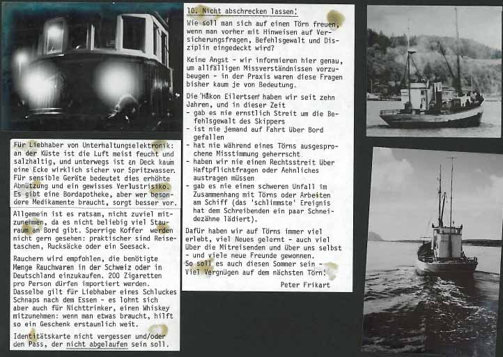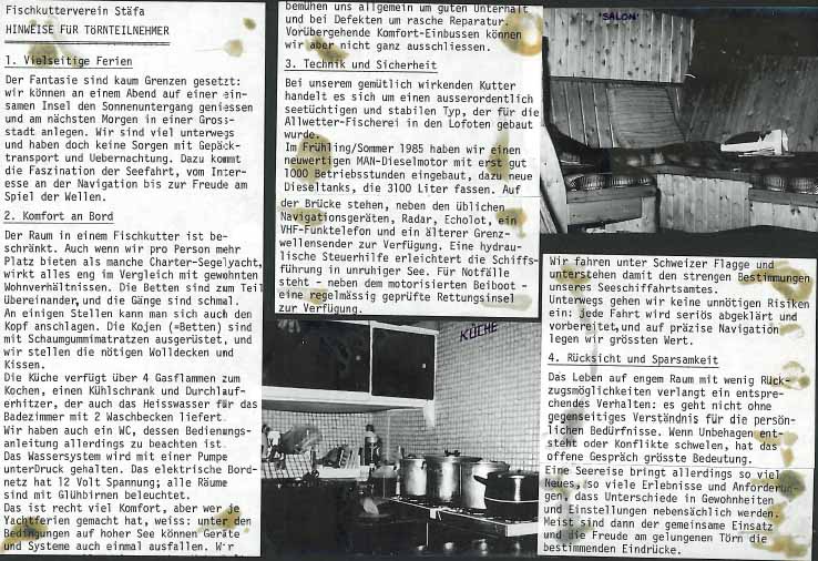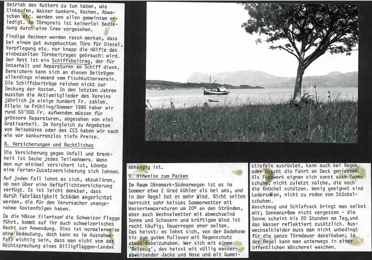 Hier die Tipps für Törns: Sie geben einen guten Einblick in die Realitäten eines Kuttertörns. Die geklebte Druckvorlage (wir haben erst ab 1987 mit Computern gearbeitet) hat wegen dem Leim etwas gelitten...